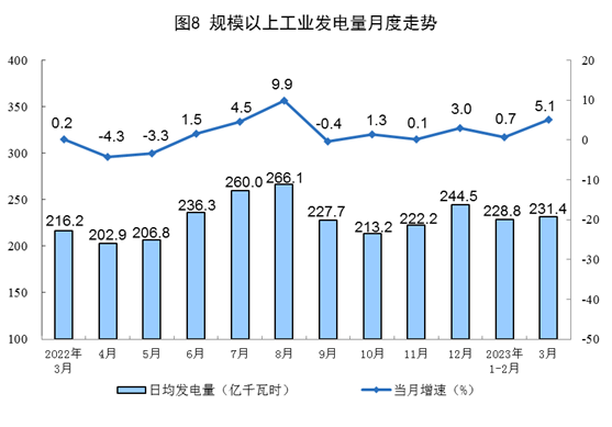 電力生產(chǎn)增速加快。3月份,發(fā)電7173億千瓦時,同比增長5.1%,增速比1—2月份加快4.4個百分點(diǎn),日均發(fā)電231.4億千瓦時。1—3月份,發(fā)電20712億千瓦時,同比增長2.4%。