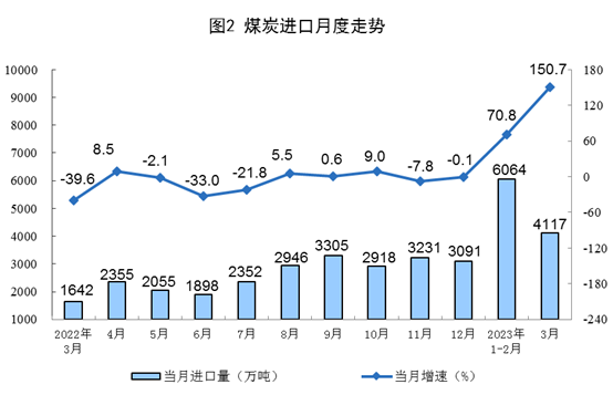 原煤生產(chǎn)穩(wěn)定增長,進(jìn)口大幅增加。3月份,生產(chǎn)原煤4.2億噸,同比增長4.3%,增速比1—2月份放緩1.5個百分點(diǎn),日均產(chǎn)量1346萬噸。進(jìn)口煤炭4117萬噸,同比增長150.7%,增速比1—2月份加快79.9個百分點(diǎn)。