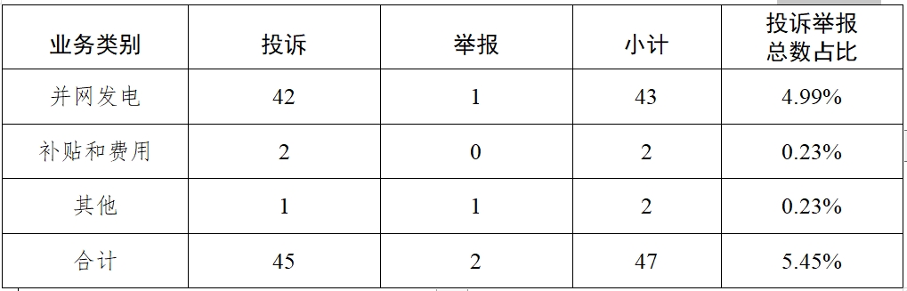 表二 新能源和可再生能源行業(yè)接收投訴舉報(bào)業(yè)務(wù)分類情況表