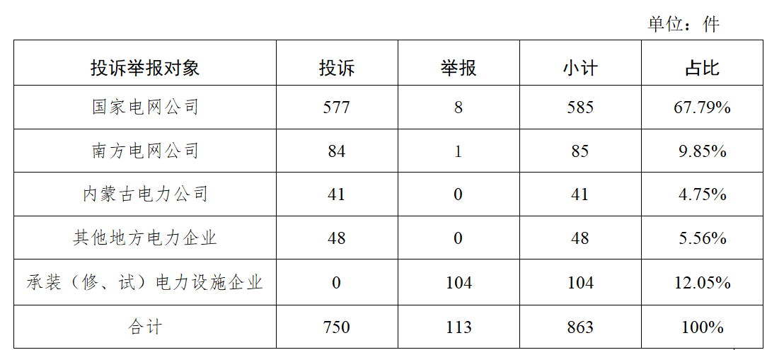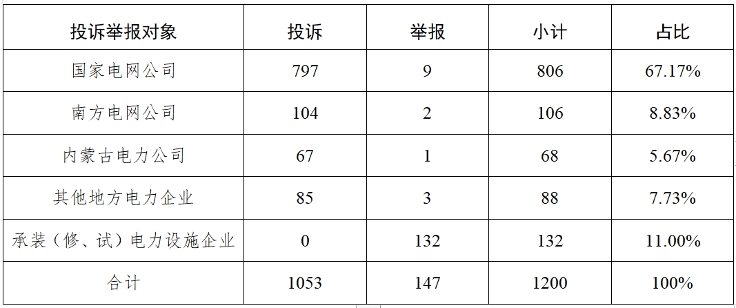 從被投訴舉報(bào)對(duì)象看,供電企業(yè)1068件、占投訴舉報(bào)總數(shù)的89.00%,其中國(guó)家電網(wǎng)公司806件、占比67.17%,南方電網(wǎng)公司106件、占比8.83%,內(nèi)蒙古電力公司68件、占比5.67%,其他地方電力企業(yè)88件、占比7.33%;承裝(修、試)電力設(shè)施企業(yè)132件、占比11.00%。