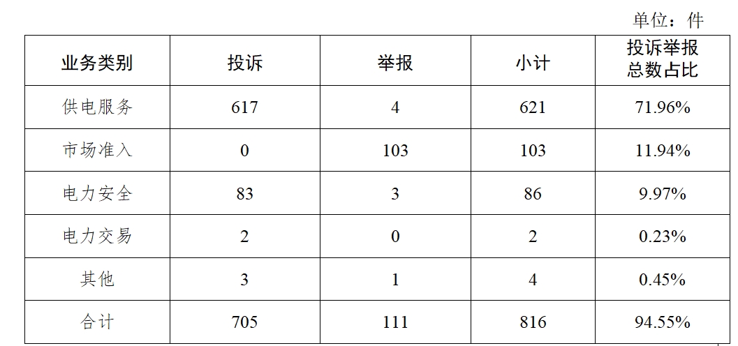 電力行業(yè)排在首位,數(shù)量為816件、占投訴舉報(bào)總數(shù)的94.55%,主要集中在供電服務(wù)、市場(chǎng)準(zhǔn)入、電力安全等方面。