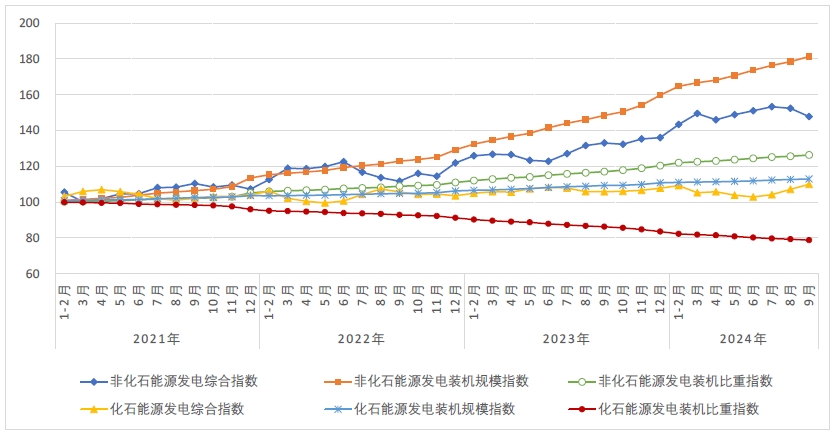9月,非化石能源發(fā)電裝機規(guī)模指數(shù)為181.4,“十四五”以來非化石能源發(fā)電裝機規(guī)模累計增長了81.4%,同比增長22.2%。非化石能源發(fā)電裝機比重指數(shù)為126.3,“十四五”以來非化石能源發(fā)電裝機比重累計提升了26.3%(比重從2020年底的44.8%提高至2024年9月底的56.5%)。