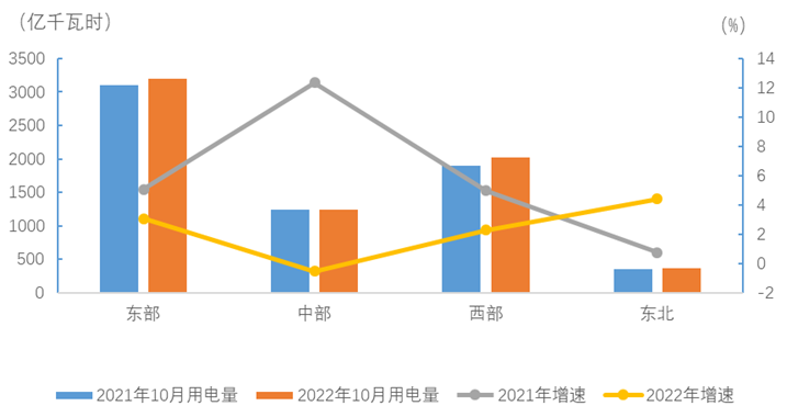 10月份,東、中、西部和東北地區(qū)全社會用電量增速分別為3.1%、-0.5%、2.3%和4.4%。