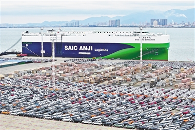 1月23日,在福建廈門(mén)東渡港區(qū)現(xiàn)代碼頭,3700余輛汽車(chē)陸續(xù)駛上“上汽安吉申誠(chéng)”號(hào)汽車(chē)滾裝船。