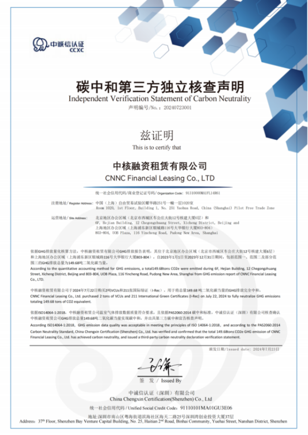 近日,中核融資租賃有限公司獲權威第三方機構中誠信認證頒發(fā)碳中和認證,成為首家實現運營碳中和的融資租賃公司。