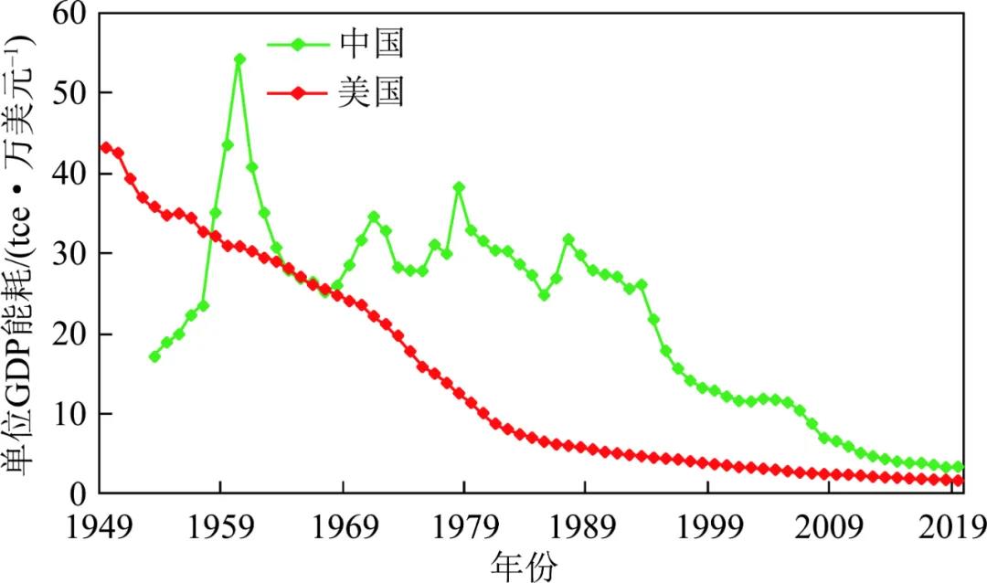 美國能源消費碳排放強度在碳達(dá)峰前期、達(dá)峰期下降幅度較小,實現(xiàn)碳達(dá)峰核心是提高能源效率,降低單位GDP能耗,在不大幅度增加能源消費的前提下,支撐經(jīng)濟增長。2019年美國單位GDP能耗僅相當(dāng)于1949年的3.9%。