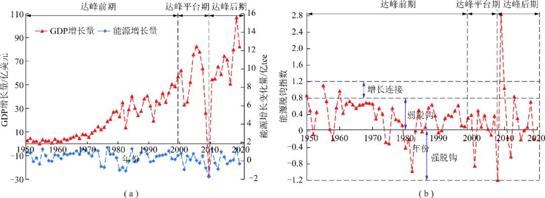 研究人員根據(jù)現(xiàn)代化進(jìn)程、能源消費和碳排放趨勢,將美國碳排放分三個階段:即碳達(dá)峰前期(1949—1999年)、碳達(dá)峰平臺期(2000—2008年)、碳達(dá)峰后期(2009年至今)。依據(jù)Tapio彈性分析法對美國能源消耗與GDP增長的脫鉤程度進(jìn)行定量分析后,得到如下認(rèn)識: