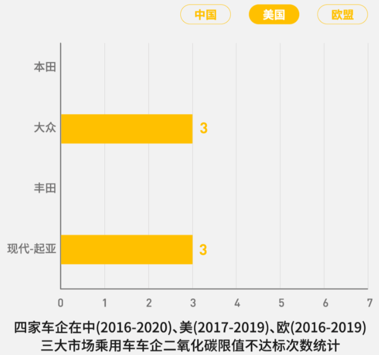 報告數(shù)據(jù)顯示,2016-2020年間,四家車企在中國均至少有兩次不達(dá)標(biāo),其中豐田五次不達(dá)標(biāo),本田與現(xiàn)代-起亞三次不達(dá)標(biāo),大眾則有兩次。