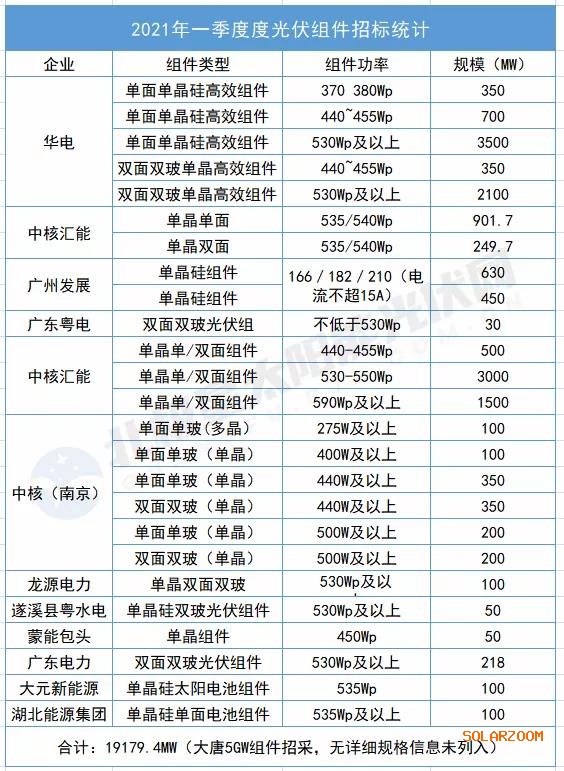 具體來(lái)看,2021年1月12日,中核匯能率先開(kāi)標(biāo)2021年度光伏組件集中采購(gòu),隆基、東方日升、天合3家擬瓜分了1.3GW組件大單,其中535/540W組件招標(biāo)規(guī)模912.7MW,占比69%。