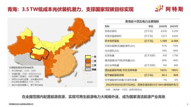 青海具有大規(guī)模發(fā)展光伏獨(dú)特的資源和區(qū)位優(yōu)勢,首先土地資源豐富,同時陽光燦爛,年日照時數(shù)3100~3600小時,年輻射量7,000~8,000 MJ/m2,位居全國第二位,僅低于西藏,相同光伏裝機(jī)容量,發(fā)電量較相鄰的甘肅和新疆高出15%~25%;青海接近中國地理中心,便于電力外送;全省光伏裝機(jī)資源潛力3.5TW,是目前全國光伏裝機(jī)總?cè)萘康氖抖啵夥l(fā)電前景廣闊,是我國實現(xiàn)雙碳目標(biāo)重要的資源支撐。