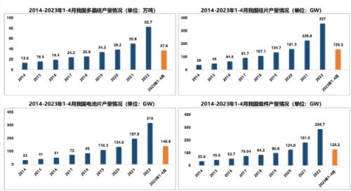 近年來(lái),我國(guó)光伏發(fā)電裝機(jī)規(guī)模持續(xù)擴(kuò)大,目前已成為全球最大的光伏應(yīng)用市場(chǎng)。2014~2022年,年均復(fù)合增長(zhǎng)率約為41.3%。2022年,我國(guó)新增光伏發(fā)電并網(wǎng)裝機(jī)容量87.41GW,連續(xù)10年穩(wěn)居世界首位。截至2022年底,我國(guó)光伏發(fā)電并網(wǎng)裝機(jī)容量達(dá)到3.9億kW,同比增長(zhǎng)28.1%,連續(xù)8年穩(wěn)居全球首位。2023年1~4月,我國(guó)新增光伏發(fā)電并網(wǎng)裝機(jī)容量48.31GW,同比增長(zhǎng)186%,已超過(guò)2022年前八個(gè)月總裝機(jī)容量。截至2023年4月底,我國(guó)光伏累計(jì)裝機(jī)4.4億kW,僅次于火力發(fā)電,在全國(guó)電力總裝機(jī)中的占比為16.6%。