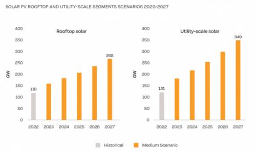 歐洲光伏產(chǎn)業(yè)協(xié)會(huì)預(yù)測(cè),到2023年,全球安裝的屋頂光伏系統(tǒng)裝機(jī)容量將增長(zhǎng)35%,預(yù)計(jì)增加到159GW。根據(jù)中期情景,到2024年,這一數(shù)字可能上升到183GW,到2027年可能達(dá)到268GW。與2022年相比,這一增長(zhǎng)將更加穩(wěn)定,因?yàn)檫@將受到能源價(jià)格回歸較低水平的推動(dòng)。