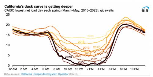 然而,鴨子曲線也為能源儲存創(chuàng)造了機(jī)會。大規(guī)模部署電池等儲能系統(tǒng),可以將白天產(chǎn)生的一些太陽能儲存起來,并在日落后釋放出來。中午儲存太陽能發(fā)電會使鴨子的曲線變平,晚上調(diào)度儲存的太陽能發(fā)電會縮短鴨子的“脖子”。加利福尼亞州正在迅速建設(shè)電池存儲;從2018年的0.2吉瓦增長到2023年4月的4.9吉瓦,預(yù)計加州運營商在今年年底前在該州再建造4.5吉瓦的電池存儲容量。