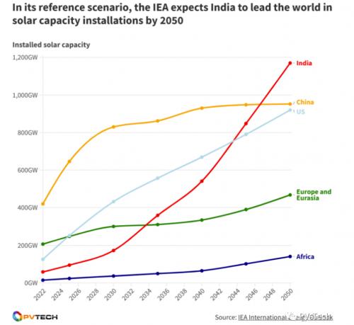 報告作者預計,至2050年,印度將成為唯一一個太陽能裝機容量超過1TW的國家,裝機總量將達到1.1TW,是歐洲和歐亞大陸468GW裝機容量的兩倍多。