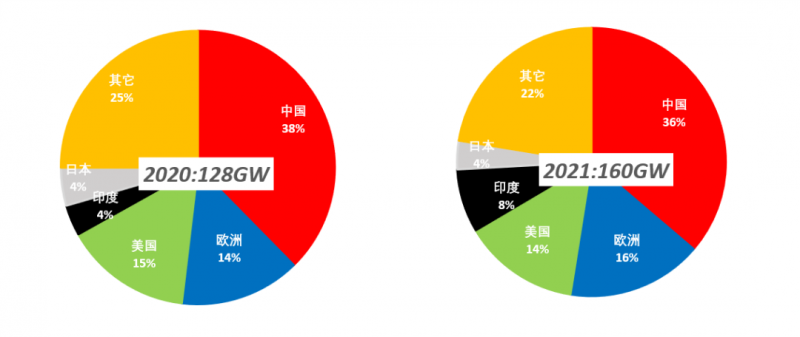 2021年光伏裝機量的增長主要來源于幾大傳統(tǒng)太陽能市場:中國/美國/歐洲/印度