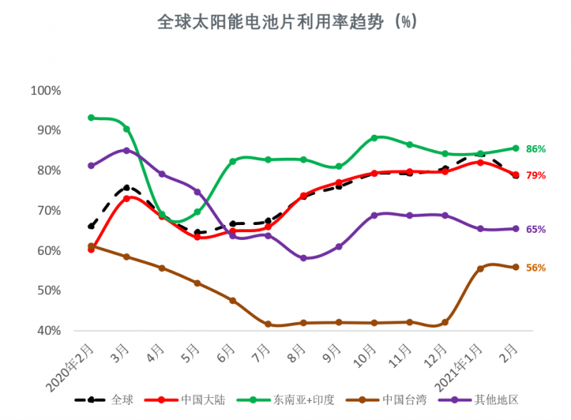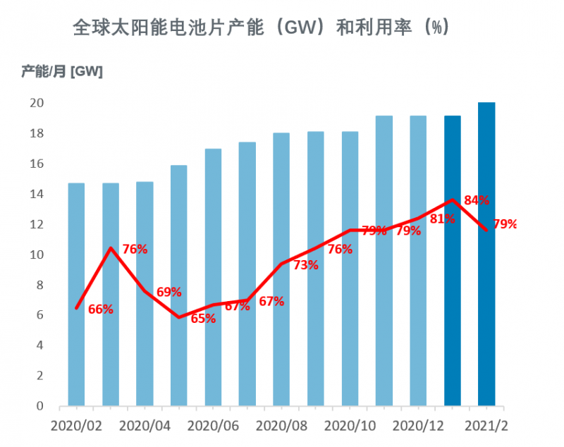 2021年2月,由于中國市場經(jīng)歷了春節(jié)假期,全球及中國大陸地區(qū)電池片產(chǎn)能利用率下降至79%