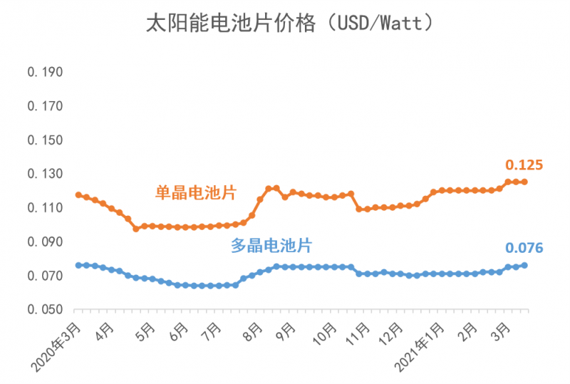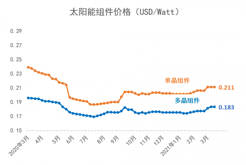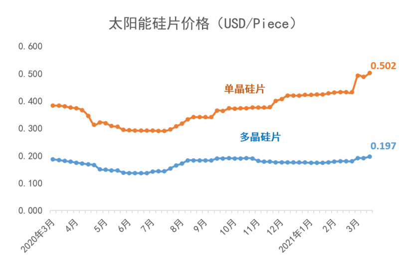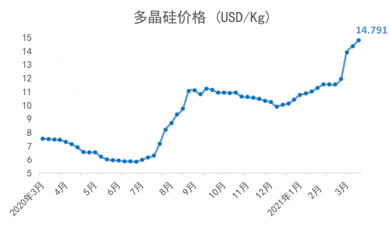 從2021年年初開始,多晶硅短缺的狀況持續(xù)加劇。2021年3月,歷經(jīng)了傳統(tǒng)的春節(jié)假期之后,上游多晶硅環(huán)節(jié)更加供不應求,目前的價格相比于2021年1月6日的價格已上漲了41%;同時,由于上游多晶用料呈現(xiàn)價格上漲,硅片端的價格同時跳漲。