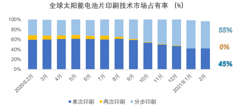 2021年1月,分步印刷技術的全球市場份額占比穩(wěn)定,保持市場主流地位