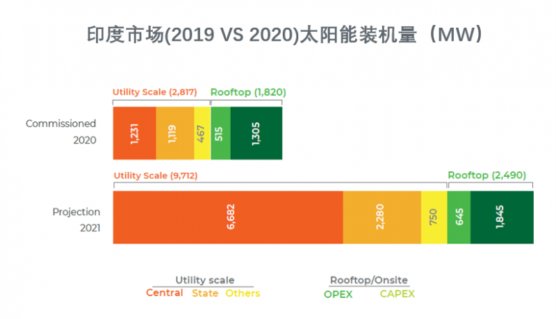 2021,印度市場預計將投產(chǎn)約9.7GW的新公用事業(yè)規(guī)模太陽能項目和2.5GW的屋頂/現(xiàn)場太陽能項目