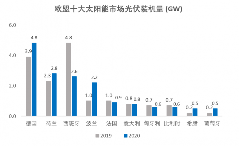 德國依然是歐洲最大的太陽能裝機市場,2020年的光伏裝機量達到了4.8GW,而西班牙的光伏裝機量則由于新冠疫情下的封城影響呈現(xiàn)了大幅下降狀態(tài)