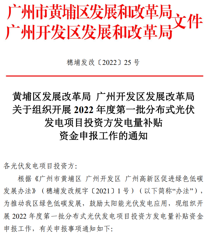 原標(biāo)題:黃埔區(qū)發(fā)展改革局 廣州開發(fā)區(qū)發(fā)展改革局 關(guān)于組織開展2022年度第一批分布式光伏發(fā)電項(xiàng)目投資方發(fā)電量補(bǔ)貼資金申報(bào)工作的通知