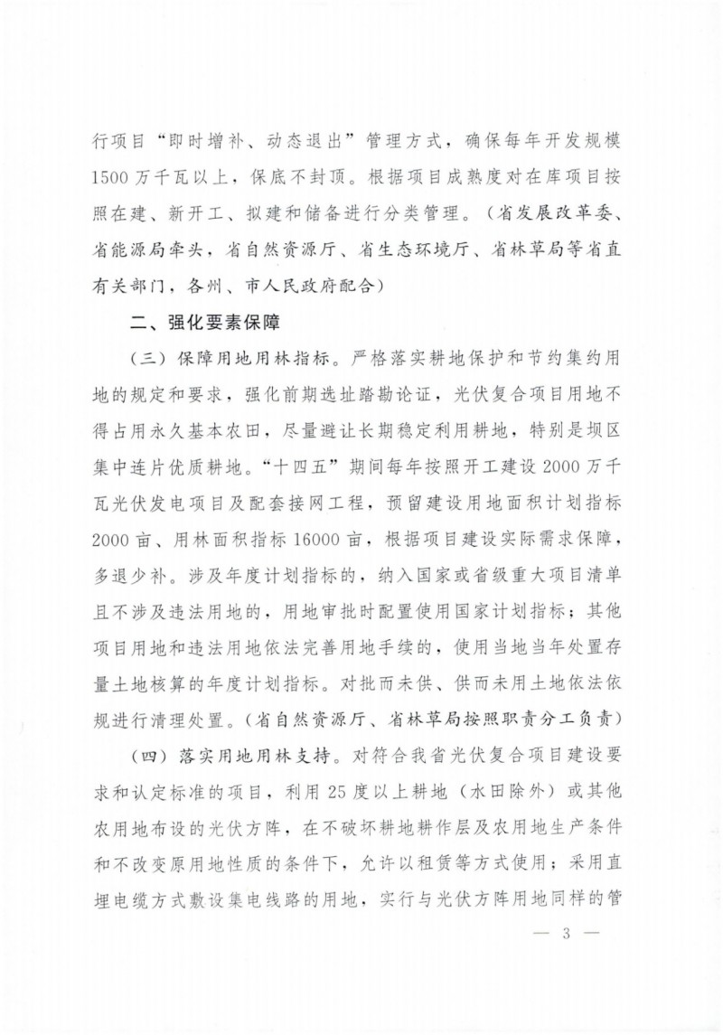“十四五”期間按照每年開工20GW光伏項目及配套接網(wǎng)工程預留建設(shè)用地面積2000畝、用林面積1600畝,根據(jù)實際需求多退少補。對于涉及國家或省級重大項目的,用地審批配置國家計劃指標。對于符合光伏復合項目建設(shè)要求和認定標準的,利用25度以上耕地或其他農(nóng)用地的,在不破壞耕地、不改變原用地性質(zhì)的項目允許以租賃方式使用。