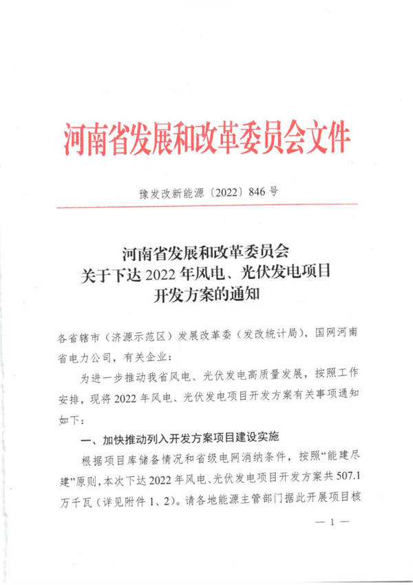 10月20日,河南省發(fā)改委發(fā)布了《關(guān)于下達(dá)2022年風(fēng)電、光伏發(fā)電項(xiàng)目開發(fā)方案》的通知。文件顯示,河南省本次下達(dá)2022年風(fēng)電、光伏發(fā)電項(xiàng)目開發(fā)方案共507.1萬千瓦。其中集中式光伏35萬千瓦,分布式光伏16.102萬千瓦;風(fēng)電456萬千瓦。其中儲能配置要求按照20%~55%、時長2~4小時不等。