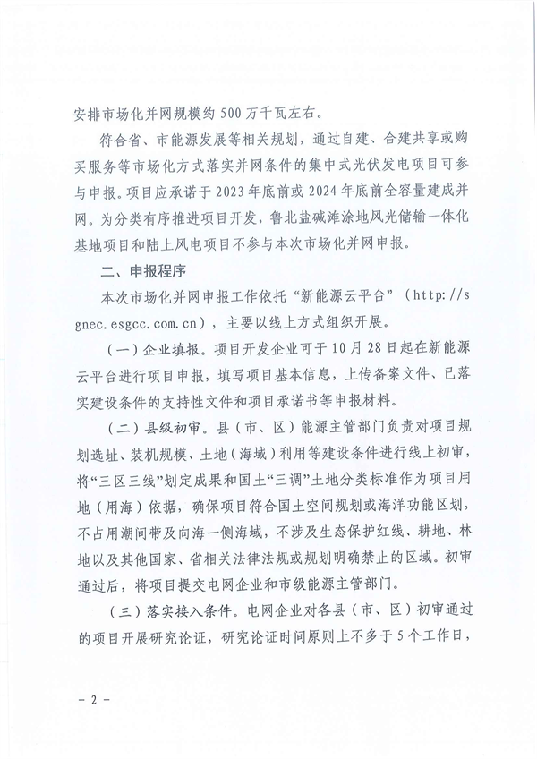符合省、市能源發(fā)展等相關規(guī)劃,通過自建、合建共享或購買服務等市場化方式落實并網(wǎng)條件的集中式光伏發(fā)電項目可參與申報。項目應承諾于2023年底前或2024年底前全容量建成并網(wǎng)。為分類有序推進項目開發(fā),魯北鹽堿灘涂地風光儲輸一體化基地項目和陸上風電項目不參與本次市場化并網(wǎng)申報。