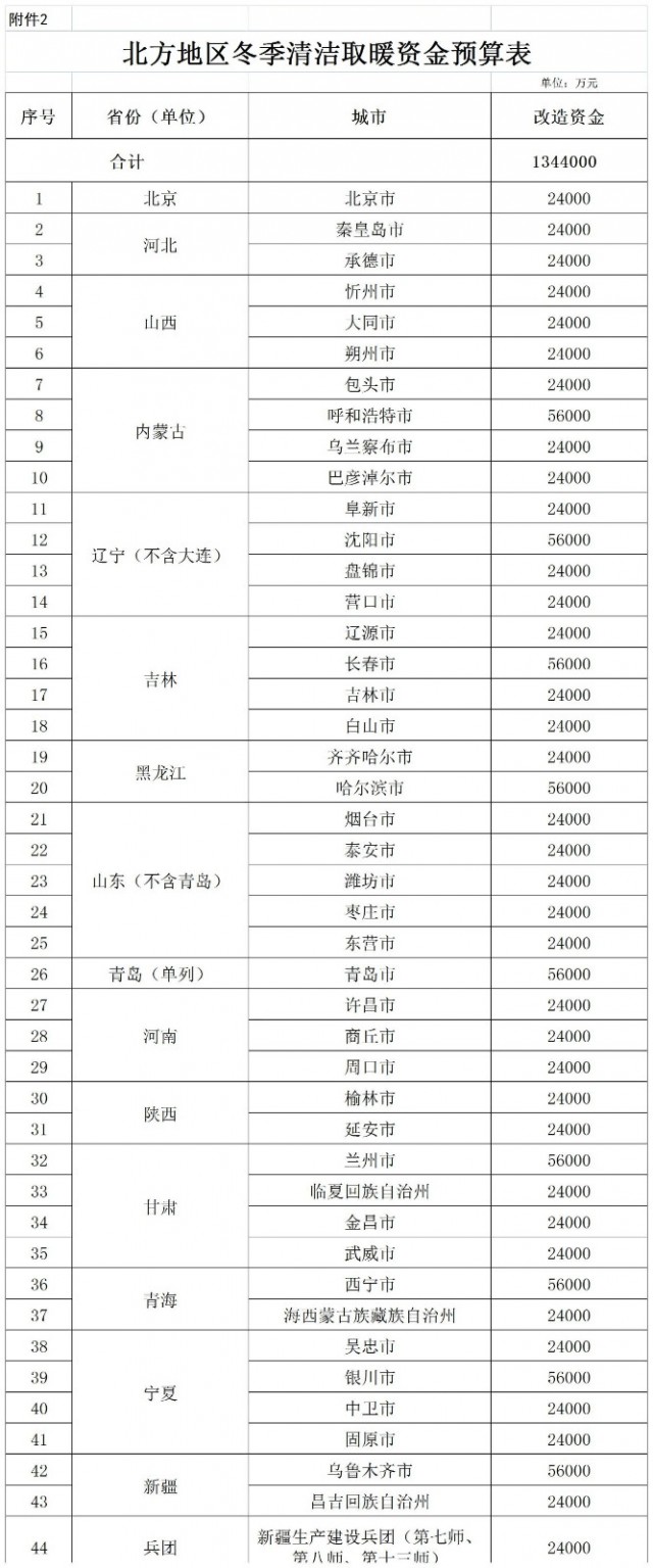 二、北方地區(qū)冬季清潔取暖資金額度詳見附件2、3。請相關(guān)省抓緊撥付資金,會(huì)同有關(guān)部門督促相關(guān)城市積極穩(wěn)妥地做好清潔取暖工作。