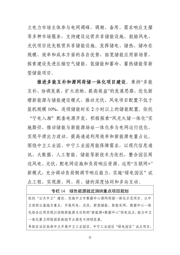穩(wěn)步建設(shè)集中式光伏電站。在沙坡頭區(qū)騰格里沙漠東南部、沙坡頭區(qū)永康鎮(zhèn)、中寧縣喊叫水鄉(xiāng)、鳴沙鎮(zhèn)、余丁鄉(xiāng)等地開(kāi)發(fā)大型集中式光伏項(xiàng)目,建成沙坡頭區(qū)“寧電入湘”配套中衛(wèi)沙漠光伏基地以及沙坡頭區(qū)永康、中寧縣喊叫水百萬(wàn)千瓦光伏平價(jià)基地項(xiàng)目,支撐中衛(wèi)市成為高比例清潔能源生產(chǎn)基地及外送通道配套新能源電源點(diǎn)。促進(jìn)光伏與其他產(chǎn)業(yè)有機(jī)融合,將光伏開(kāi)發(fā)與荒山荒漠綜合利用治理、枸杞種植、牧草種植、奶牛養(yǎng)殖、漁業(yè)養(yǎng)殖、沙漠生態(tài)旅游等相結(jié)合,因地制宜建設(shè)各類(lèi)“光伏+”綜合利用示范項(xiàng)目,帶動(dòng)各產(chǎn)業(yè)協(xié)同發(fā)展,實(shí)現(xiàn)土地資源集約高效利用。結(jié)合已投運(yùn)、在建及規(guī)劃建設(shè)的風(fēng)電場(chǎng),充分發(fā)揮風(fēng)、光資源的互補(bǔ)優(yōu)勢(shì),推進(jìn)風(fēng)光互補(bǔ)電站建設(shè)。