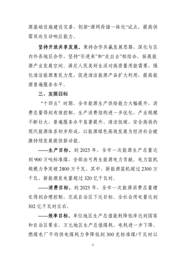 生產(chǎn)目標(biāo):到2025年,全市一次能源生產(chǎn)總量達(dá)到900萬(wàn)噸標(biāo)準(zhǔn)煤,全部由可再生能源電力貢獻(xiàn)。電力裝機(jī)規(guī)模力爭(zhēng)突破2800萬(wàn)千瓦,其中,新能源裝機(jī)超過(guò)2300萬(wàn)千瓦,新能源發(fā)電量超過(guò)320億千瓦時(shí)。