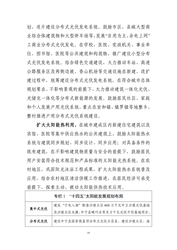 加快開(kāi)發(fā)分布式光伏資源。開(kāi)展中寧縣、沙坡頭區(qū)、海原縣整縣屋頂分布式光伏開(kāi)發(fā)試點(diǎn)。在中衛(wèi)工業(yè)園區(qū)、中寧工業(yè)園區(qū)和海興開(kāi)發(fā)區(qū),科學(xué)選取工業(yè)廠(chǎng)房及附屬空閑場(chǎng)地,統(tǒng)一規(guī)劃、連片建設(shè)分布式光伏發(fā)電系統(tǒng)。在學(xué)校、醫(yī)院、黨政機(jī)關(guān)、事業(yè)單位、圖書(shū)館、醫(yī)院等公共建筑和構(gòu)筑物,推廣建設(shè)小型分布式光伏發(fā)電系統(tǒng)。結(jié)合綠色交通建設(shè),大力推動(dòng)車(chē)站、高速公路服務(wù)區(qū)及兩側(cè)邊坡、香山機(jī)場(chǎng)等交通設(shè)施在新建、改擴(kuò)建過(guò)程中,統(tǒng)籌建設(shè)分布式光伏發(fā)電系統(tǒng)。在符合城市總體規(guī)劃要求、不影響景觀(guān)的前提下,大力推動(dòng)建筑一體化光伏、光儲(chǔ)充一體化等分布式新能源的發(fā)展。鼓勵(lì)居民社區(qū)、家庭和個(gè)人發(fā)展戶(hù)用光伏系統(tǒng),重點(diǎn)在宣和鎮(zhèn)、鎮(zhèn)羅鎮(zhèn)等地整鄉(xiāng)、整村推進(jìn)戶(hù)用分布式光伏系統(tǒng)建設(shè)。