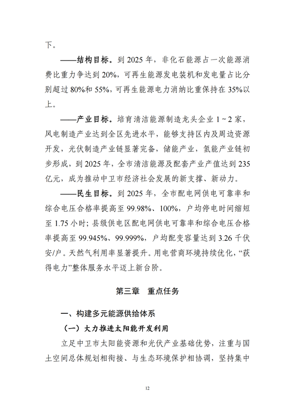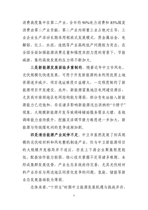 12月14日,寧夏中衛(wèi)市發(fā)改委發(fā)布《中衛(wèi)市能源產(chǎn)業(yè)發(fā)展“十四五”規(guī)劃(征求意見(jiàn)稿)》。意見(jiàn)稿顯示,“十四五”期間,全市提出發(fā)展目標(biāo),能源生產(chǎn)供給能力大幅提升,消費(fèi)總量得到有效控制,生產(chǎn)消費(fèi)結(jié)構(gòu)進(jìn)一步優(yōu)化,產(chǎn)業(yè)規(guī)模不斷壯大,普遍服務(wù)水平顯著提升,清潔低碳、安全高效的現(xiàn)代能源體系初步形成,以能源綠色高效發(fā)展為經(jīng)濟(jì)社會(huì)健康持續(xù)發(fā)展提供新動(dòng)能。