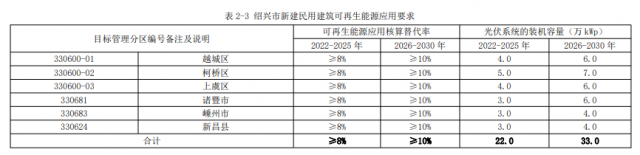 12月26日,紹興市建設(shè)局公示《紹興市綠色建筑專項(xiàng)規(guī)劃(2022-2030)(草案)》,其中提到,新建民用建筑(農(nóng)民自建住宅除外),應(yīng)當(dāng)按照國(guó)家和省有關(guān)標(biāo)準(zhǔn)利用可再生能源。可再生能源利用設(shè)施應(yīng)當(dāng)與建筑主體一體化設(shè)計(jì),同步施工、同步驗(yàn)收。新建民用建筑應(yīng)采用可再生能源系統(tǒng),應(yīng)配置太陽(yáng)能系統(tǒng),滿足浙江省工程建設(shè)標(biāo)準(zhǔn)《民用建筑可再生能源應(yīng)用核算標(biāo)準(zhǔn)》的要求。 至2025 年,紹興市各縣(市、區(qū))新建民用建筑可再生能源應(yīng)用核算替代率達(dá)到 8%,太陽(yáng)能光伏系統(tǒng)的裝機(jī)容量達(dá)到 22.0 萬(wàn) kWp。至 2030 年,紹興市各縣(市、區(qū))新建民用建筑可再生能源應(yīng)用核算替代率達(dá)到 10%,太陽(yáng)能光伏系統(tǒng)的裝機(jī)容量達(dá)到 33.0 萬(wàn) kWp。
