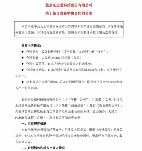 2月17日,京運(yùn)通(601908.SH)公告稱,公司于2022年2月16日與曲靖晶澳簽訂《設(shè)備采購合同》,向曲靖晶澳出售軟軸全自動(dòng)單晶爐及單晶生長控制系統(tǒng),總金額合計(jì)5.4億元(含稅)。