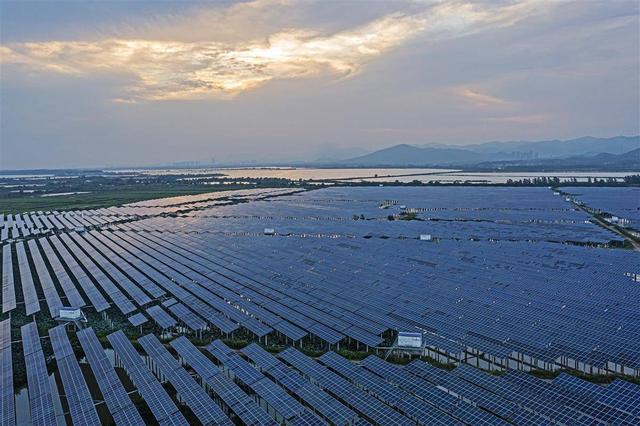 7月24日,航拍視角下的黃石新港大成100MW“漁光互補(bǔ)”光伏電站,一排排藍(lán)色的光伏板在水塘上整齊排列、連線成片,源源不斷的將太陽光能轉(zhuǎn)化為電能,蔚為壯觀的景象給這片土地平添了幾分科技感。近日,黃石新港大成100MW漁光互補(bǔ)光伏電站全容量并網(wǎng),年發(fā)電量約1.1億度,可滿足55萬戶家庭一個(gè)月的用電量,每年減排二氧化碳約8.4萬噸。