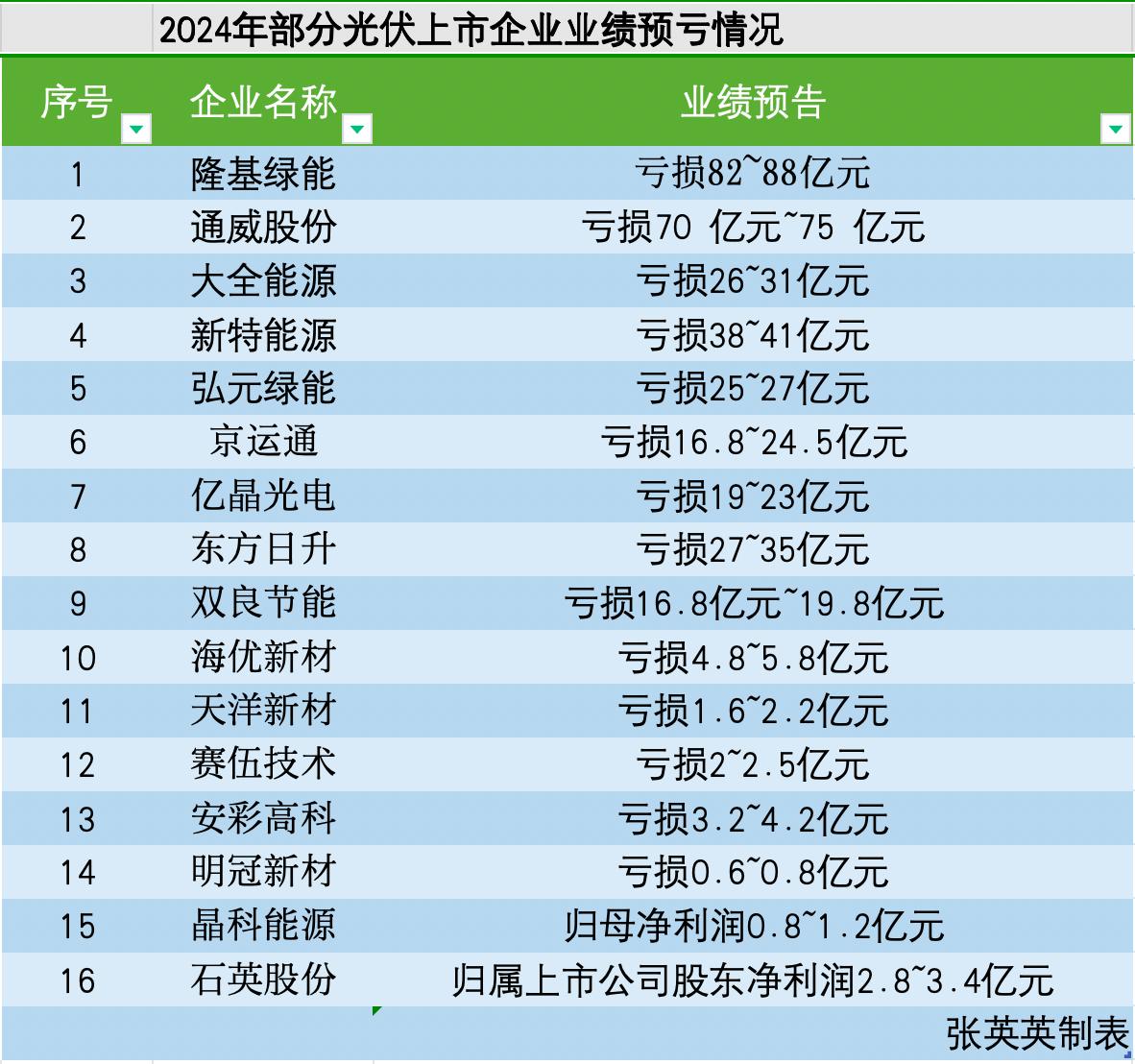 業(yè)績(jī)預(yù)告顯示,隆基綠能預(yù)計(jì)虧損82億到88億元,通威股份預(yù)計(jì)虧損70億至75億元,新特能源預(yù)計(jì)虧損38億至41億元,大全能源預(yù)計(jì)虧損26億至31億元,弘元綠能(603185.SH)預(yù)計(jì)虧損25億至27億元,東方日升預(yù)計(jì)虧損27億至35億元,億晶光電預(yù)計(jì)虧損19億至23億元,京運(yùn)通(601908.SH)預(yù)計(jì)虧損16.8億至24.5億元,雙良節(jié)能(600481.SH)預(yù)計(jì)虧損16.8億至19.8億元。