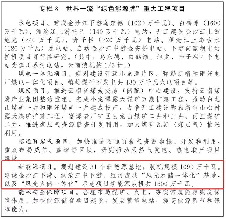 在具體項目方面,“十四五”期間,云南將規(guī)劃建設(shè)31個新能源基地,裝機規(guī)模為1090萬千瓦,建設(shè)金沙江下游、瀾滄江中下游、紅河流域“風(fēng)光水儲一體化”基地以及“風(fēng)光火儲一體化”示范項目新能源裝機共1500萬千瓦。