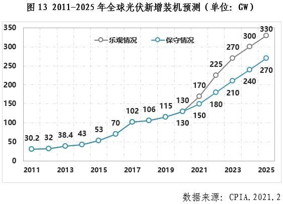 (二)我國光伏市場將進入快速發(fā)展新階段2021年是“十四五”規(guī)劃的開局之年,也是我國光伏發(fā)電進入平價上網(wǎng)的關(guān)鍵之年。2021年我國光伏應(yīng)用市場將繼續(xù)保持快速增長勢頭,預(yù)計新增裝機規(guī)模可達55-65GW,其中競價結(jié)轉(zhuǎn)項目10GW左右,戶用市場有望達到15GW,工商業(yè)分布式預(yù)計在10GW左右,外送及平價地面電站在20-30GW左右。在“碳達峰、碳中和”目標下, “十四五”期間我國光伏市場將迎來市場化建設(shè)高峰,預(yù)計國內(nèi)年均光伏裝機新增規(guī)模在70-90GW,有望進一步加速我國能源轉(zhuǎn)型。