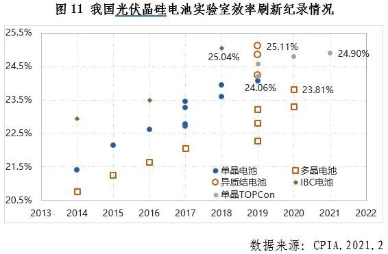 實驗室方面,2020年4月,晶科研發(fā)的多晶硅(Multicrystalline)電池片實驗室效率達到23.3%,并被收錄于NREL電池片轉(zhuǎn)換效率紀錄表中,隨后阿特斯宣布將該效率提高至23.81%。7月,晶科宣布其研發(fā)的N型單晶硅單結(jié)電池片效率達到24.79%,2021年1月,將該紀錄再次刷新到24.90%,創(chuàng)造了新的大面積N型單晶鈍化接觸電池片效率世界紀錄。我國除了在晶硅電池技術(shù)方面領(lǐng)先全球外,鈣鈦礦、有機電池等電池片實驗室效率也走在世界前列,2020年7月,杭州纖納光電以18.04%的鈣鈦礦小組件光電轉(zhuǎn)換效率的成績,第七次蟬聯(lián)了鈣鈦礦小組件世界紀錄榜首。目前NREL電池片轉(zhuǎn)換效率紀錄表中,除晶科的多晶硅電池片外,上海交大/北航、中科院化學(xué)所和漢能分別研發(fā)的有機電池、有機疊層電池和薄膜電池仍保持著世界紀錄。