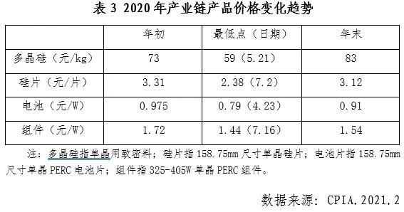(四)產(chǎn)業(yè)鏈供給矛盾突出2020年,光伏產(chǎn)品價格經(jīng)歷了V字型起伏的過程,光伏產(chǎn)業(yè)硅料、玻璃和EVA膠膜等部分原輔材料環(huán)節(jié)出現(xiàn)的供需緊張也前所未有。上半年,受全球疫情蔓延影響,對下游應(yīng)用市場未來需求的不確定性導(dǎo)致產(chǎn)業(yè)鏈大幅降價,各環(huán)節(jié)價格降幅均在20%左右。硅料環(huán)節(jié),三季度受到事故及自然災(zāi)害等因素影響供應(yīng)緊張,8月多晶硅致密料價格由6月的59元/公斤增加至約95元/公斤,漲幅約為60%;四季度隨著新疆地區(qū)硅料企業(yè)復(fù)工,多晶硅價格回落,但仍高于二季度價格低點38%。EVA膠膜的生產(chǎn)設(shè)備及原材料EVA粒子可用于防疫物資生產(chǎn),2020年防疫物資需求暴漲,使得生產(chǎn)設(shè)備及EVA粒子供應(yīng)緊張,膠膜企業(yè)擴產(chǎn)受阻延遲,在下半年需求暴漲的情況下,EVA膠膜企業(yè)只能通過大幅漲價的方式來獲取EVA粒子資源。下半年EVA膠膜價格上漲了50%,一度達到14元/平方米的高價,和POE膠膜的價格形成了倒掛。下半年需求的集中爆發(fā)導(dǎo)致光伏玻璃供給出現(xiàn)巨大缺口,價格快速上漲,年底3.2mm光伏玻璃價格達到了43元/平方米,較5-6月最低時上漲80%,部分企業(yè)采用浮法玻璃作為雙面組件的背板玻璃。進入12月,產(chǎn)品價格趨于平緩。但全年來看,除多晶硅價格上漲13.7%以外,硅片、電池、組件產(chǎn)品價格仍分別下降了5.7%、6.7%與10.5%,降本增效發(fā)展方向沒有變,長期來看價格依然是下降趨勢。