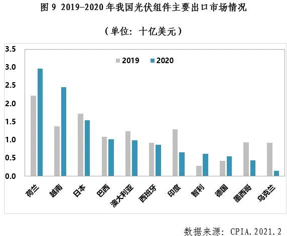 從光伏組件出口市場來看,2020年光伏組件主要出口市場中傳統(tǒng)市場活力不減,其中荷蘭和越南市場份額增長明顯。在光伏發(fā)電成本持續(xù)降低以及歐盟綠色協(xié)議的背景下,歐洲市場保持增長勢頭,荷蘭作為歐洲市場的集散中心出口量持續(xù)增長。越南新一輪FIT政策引發(fā)了越南屋頂光伏的搶裝熱潮,根據(jù)越南工貿(mào)部的公告顯示,2020年越南光伏新增裝機為10.75GW,成為全球前3大光伏市場,其中屋頂光伏裝機超過9GW。越南市場新增裝機猛增,對我國組件需求明顯增長,成為第二大光伏組件出口市場。印度市場受疫情影響,市場需求下降較為明顯。曾經(jīng)的新興市場烏克蘭因其國內(nèi)電價的下降致使光伏項目的收益有所降低,投資熱情減退,市場需求下降。墨西哥市場受到清潔能源拍賣的取消以及后續(xù)政策不確定性的影響未能延續(xù)之前的增長勢頭,市場需求有所下降。