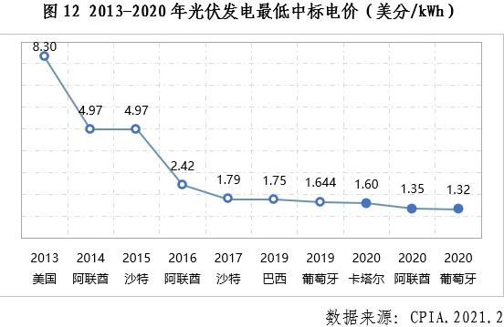 (五)光伏發(fā)電電價與成本持續(xù)下降2020年,全球光伏發(fā)電中標電價繼續(xù)下降,僅一年中全球就有三個項目接連創(chuàng)造了最低中標電價。8月,位于葡萄牙一光伏項目中標電價達到了0.0112歐元/kWh(約1.32美分/kWh),折合當時人民幣價格約0.091元/kWh。這一電價比2019年最低中標電價降低了0.324美分/kWh,降幅達到19.7%。2020年,我國光伏發(fā)電項目中標電價也刷新最低紀錄,青海海南州一光伏發(fā)電競價項目中標電價為0.2427元/kWh(約3.46美分/kWh),低于2019年達拉特旗光伏項目0.26元/kWh的電價。除此之外,卡塔爾、阿聯(lián)酋、印度等國光伏中標電價也打破了原來的最低紀錄。光伏發(fā)電價格已經(jīng)在全球越來越多的國家及地區(qū)低于火電,成為了最具競爭力的電力產(chǎn)品。