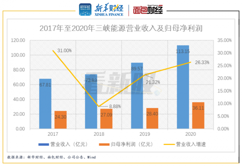 三峽能源主營業(yè)務(wù)為風(fēng)能、太陽能的開發(fā)、投資和運營。2018年至2020年,公司實現(xiàn)營業(yè)收入分別為73.83億元、89.57億元、113.15億元,同比分別增加8.88%、21.32%、26.33%;實現(xiàn)歸母凈利潤分別為27.09億元、28.40億元、36.11億元,同比分別增加11.48%、4.84%、27.16%。
