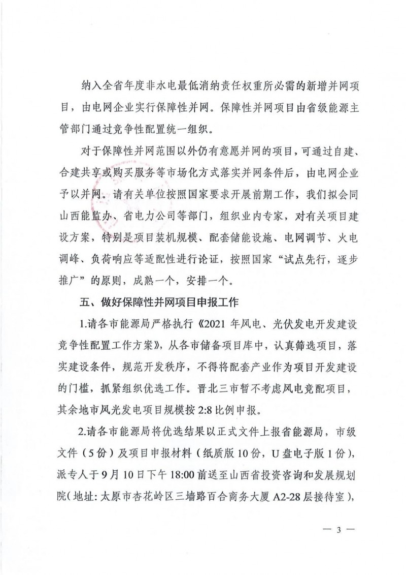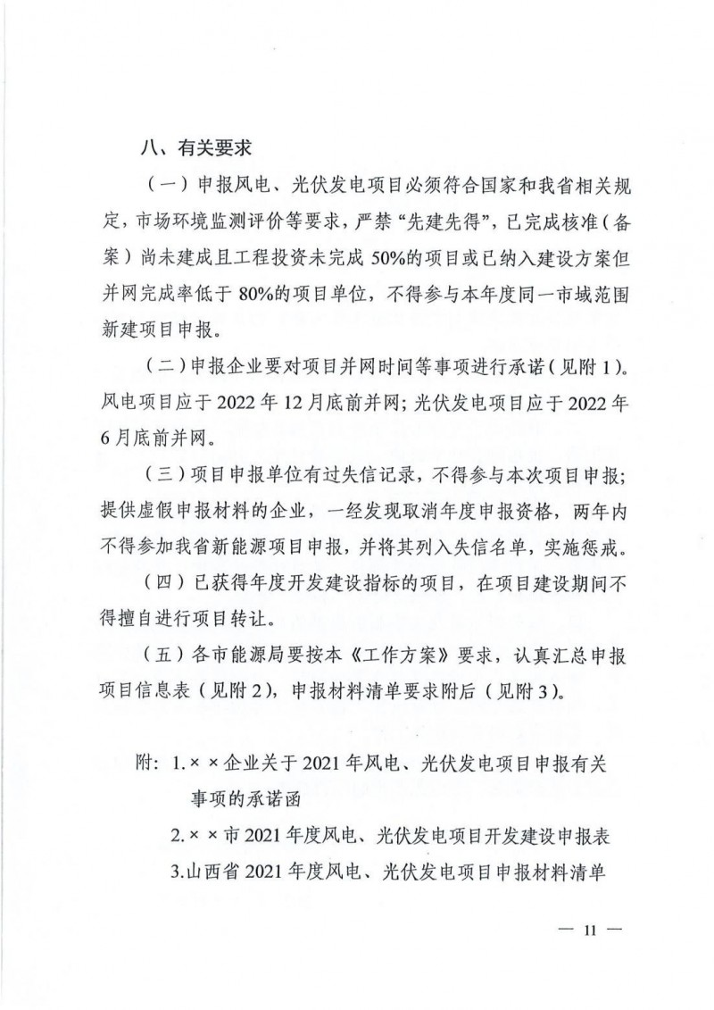 申報風(fēng)電項(xiàng)目應(yīng)于2022年12月底前并網(wǎng);光伏發(fā)電項(xiàng)目應(yīng)于2022年6月底前并網(wǎng)。申報材料于9月10日下午18:00前送至山西省投資咨詢和發(fā)展規(guī)劃院。