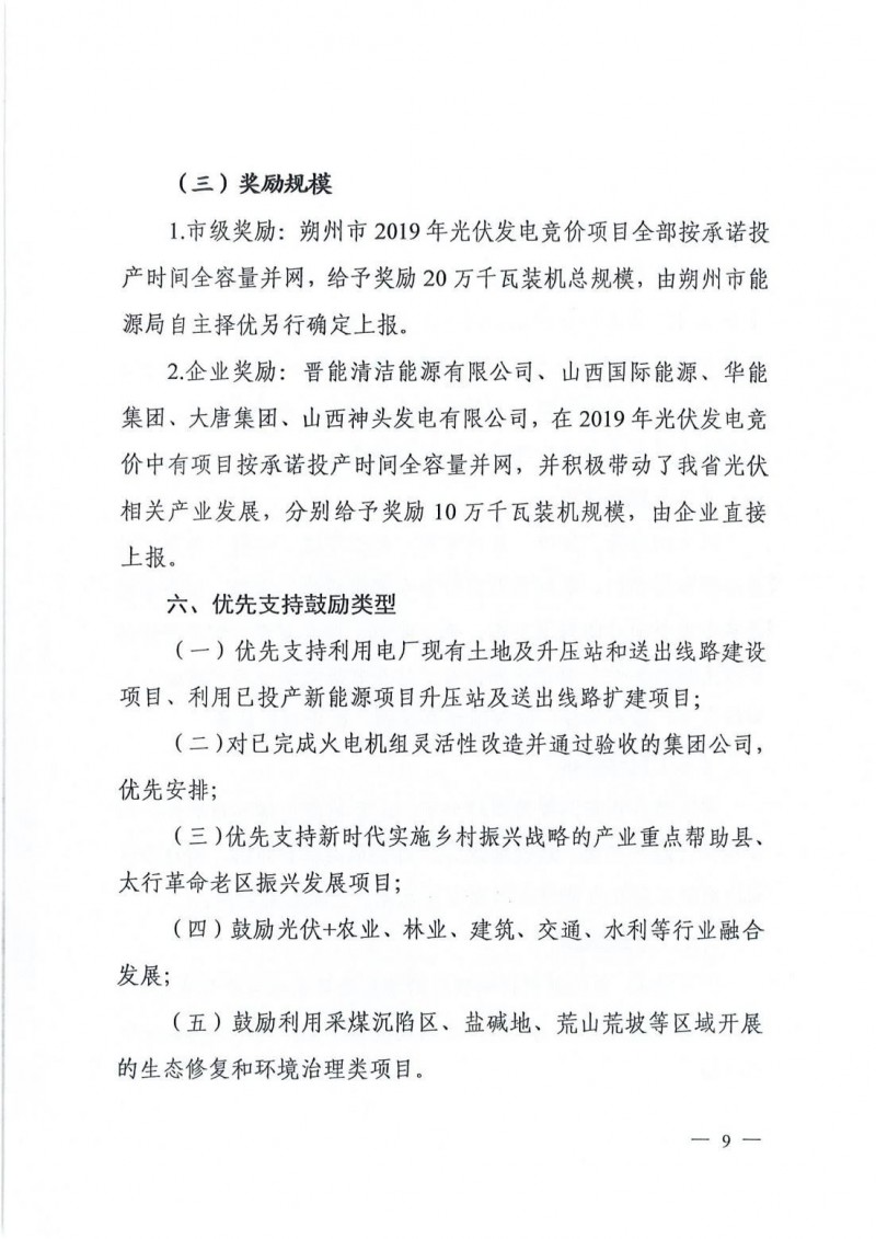 值得注意的是,為了鼓勵光伏建設(shè),山西省進(jìn)行了市級獎勵和企業(yè)獎勵。其中,朔州市2019年光伏發(fā)電競價項(xiàng)目全部按承諾投產(chǎn)時間全容量并網(wǎng),給予獎勵20萬千瓦裝機(jī)總規(guī)模,由朔州市能源局自主擇優(yōu)另行確定上報。