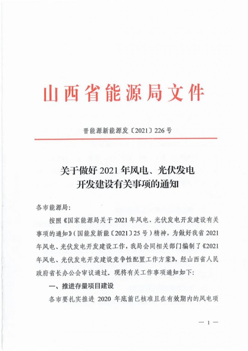 8月26日,山西省能源局印發(fā)《關(guān)于做好2021年風(fēng)電、光伏發(fā)電開發(fā)建設(shè)有關(guān)事項(xiàng)的通知》。通知中對山西省的2021年的光伏、風(fēng)電工作做了規(guī)劃。