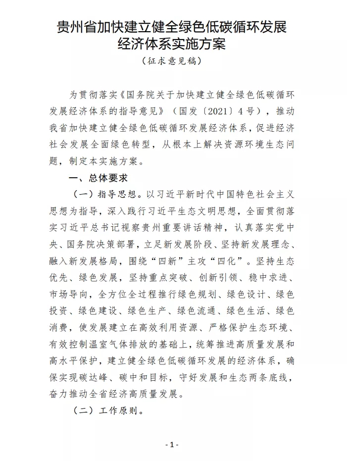 10月12日,貴州省發(fā)改委發(fā)布《貴州省加快建立健全綠色低碳循環(huán)發(fā)展經(jīng)濟(jì)體系實(shí)施方案(征求意見(jiàn)稿)》 公開(kāi)征求意見(jiàn)。