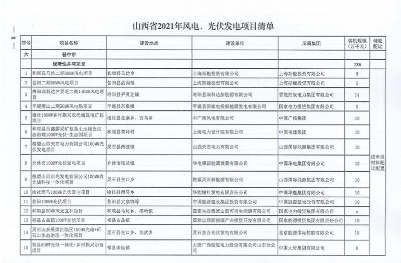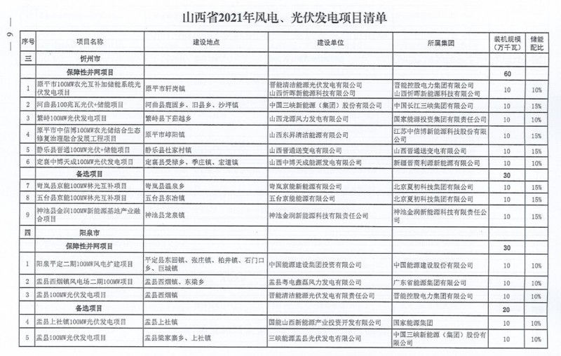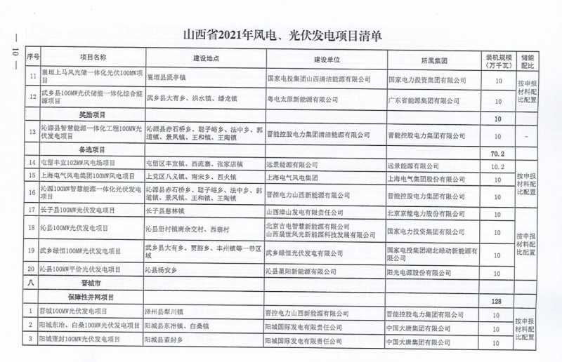 10月22日,山西省能源局下達(dá)2021年度風(fēng)電、光伏發(fā)電保障性并網(wǎng)年度建設(shè)計劃。風(fēng)、光合計17.792GW,其中保障性11.2GW+獎勵700MW+備選5.892GW。文件明確保障性規(guī)模與獎勵規(guī)??赏介_展前期工作,優(yōu)先保證保障性并網(wǎng)項目和獎勵項目并網(wǎng),如上述項目未能按承諾時間并網(wǎng),將視項目成熟度、建設(shè)進(jìn)度和接入條件等,從備選項目中選擇并網(wǎng)項目,保障完成國家下達(dá)的最低消納責(zé)任權(quán)重。