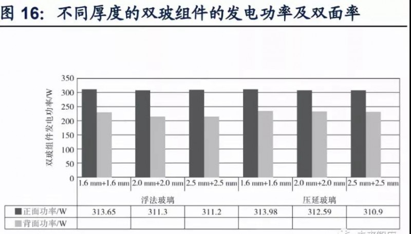 超白浮法玻璃力學性能更優(yōu),薄化后作為背板的發(fā)電功率接近超白壓延玻璃,陸續(xù)出現(xiàn)組件廠商采用超白浮法玻璃作為背板以降低成本。浮法玻璃表面平整度高,抗沖擊強度較壓延玻璃更為出色,并且隨著厚度降低,二者抗沖擊強度相差拉大,在1.6 mm浮法玻璃平均破碎高度高出超白壓延玻璃達97.77%。另外,雖然浮法玻璃透過率不如超白壓延玻璃,作為雙玻組件背板后會導致背面發(fā)電功率降低,但隨著厚度減小,二者發(fā)電功率差距逐漸降低,1.6mm雙玻組件下的背面發(fā)電功率相差僅為5.45W。浮法玻璃作為組件背板使用時,雙玻組件正面發(fā)電功率也可達到壓延玻璃作為背板時的發(fā)電功率。因此陸續(xù)有組件公司為降低生產(chǎn)成本,使用浮法玻璃作為背板。